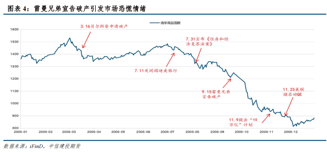 2008年3月16日,著名投行贝尔斯登申请破产,后由美联储通过摩根大通提供紧急支持进行救助,这一风险事件已引发市场担忧。2008年9月15日,雷曼兄弟宣告破产,引发全球金融市场恐慌情绪蔓延,金融危机进入新阶段。