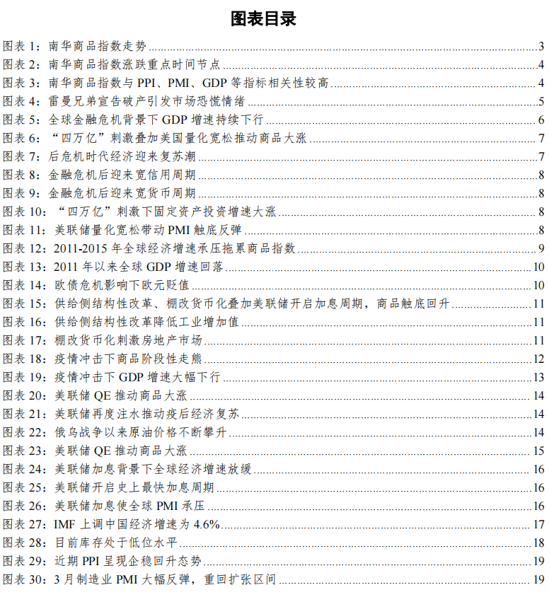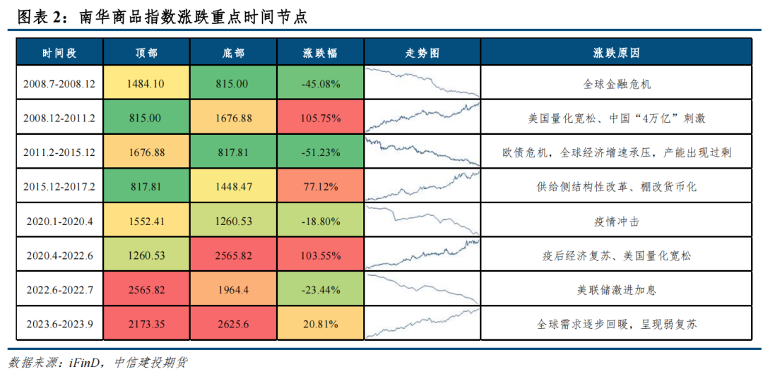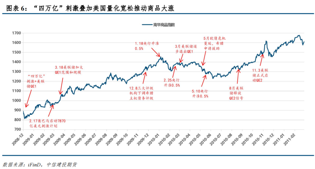 (1)2008年:全球金融危机引发的系统性风险,导致商品价格大跌。此后国内“四万亿”刺激和美国量化宽松政策刺激,在经济大幅修复背景下,南华商品指数回升。