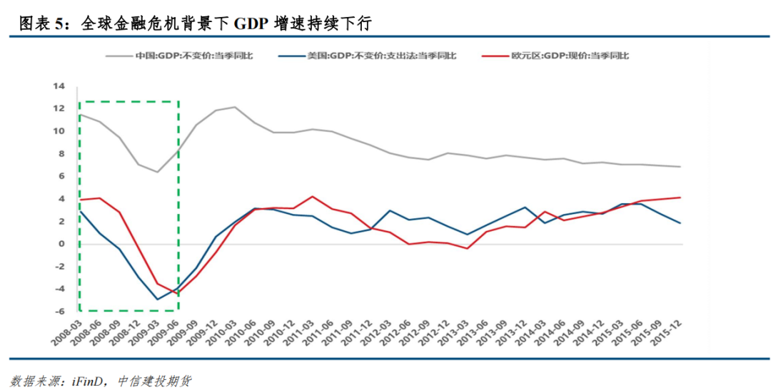 2008年3月开始,伴随贝尔斯登申请破产,金融危机发酵,全球主要经济体GDP增速开始下滑。2008年9月,雷曼兄弟宣告破产,GDP增速下行斜率陡峭,直至2009年3月才开始筑底企稳。