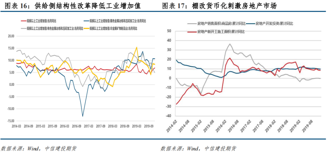 供给侧结构性改革下,相关行业工业增加值降低,钢铁、玻璃、水泥、有色等大宗商品价格均出现趋势性上行。需求端,棚改货币化推动房地产迎来繁荣周期,开发、新开工、销售面积均大幅上涨,销售面积同比一度超过30%。