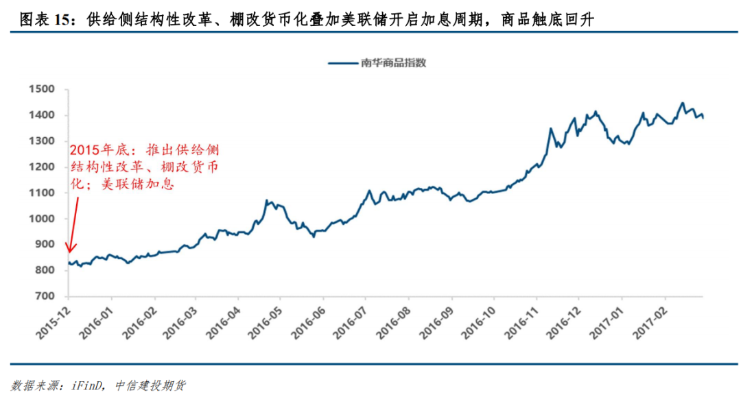 ④ 2015.12-2017.2:供给侧结构性改革+棚改货币化驱动、美联储开启加息周期,商品触底回升