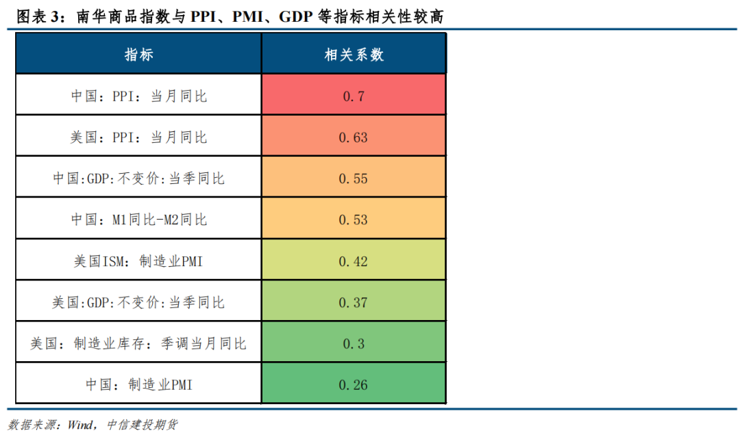 通过计算南华商品指数(同比)与各指标的相关性,可以得出反映生产端价格和经济景气度的 PPI、PMI 指数以及 GDP 同比与南华商品价格指数的相关性较高,尤其是 PPI 相关系数达到 0.6 以上。