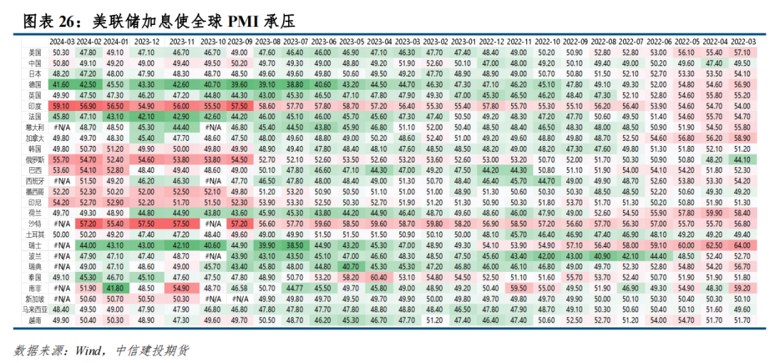 但随着加息收紧带来的利空出尽,商品走势逐步企稳。2023年6月以后,部分国家PMI有回暖趋势,经济又呈现一定的弱复苏态势。