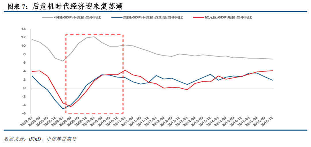 在诸多高强度刺激下,全球流动性充裕程度提高。GDP增速企稳回升至危机前水平,中国GDP增速回升至 10%中枢水平,欧美GDP打破负增长,经济企稳回升。