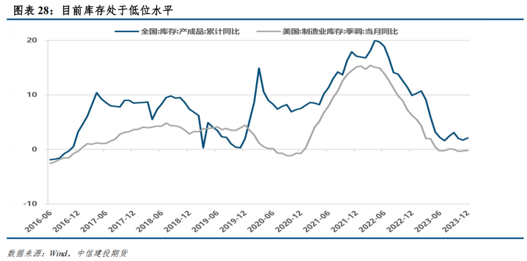 目前中美库存均处于历史较低水平,预计下游将迎来补库进程,遇到商品低点将带来潜在利好。