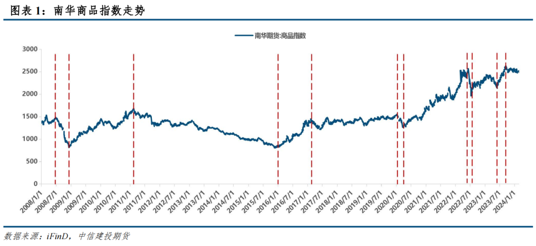 整体来看,南华商品指数呈现明显周期性涨跌,较为明显的是: