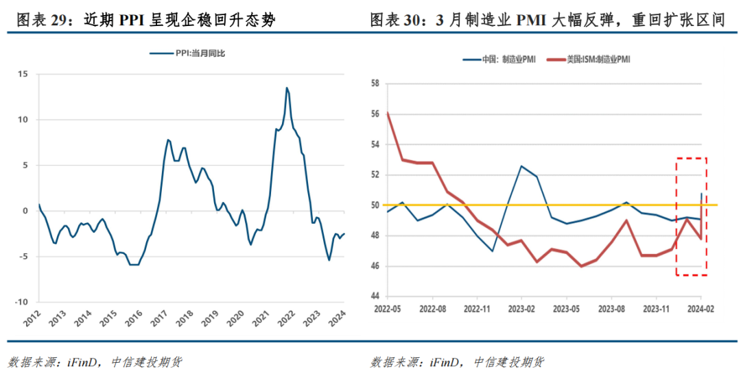 2023年下半年以来,中国PPI同比增速低位回升,表现出企稳迹象,预计未来PPI跌幅将继续收窄。中国3月制造业PMI超季节性反弹至50.8,重回扩张区间,环比上行1.7个点,超出市场预期,显示我国需求改善幅度较为明显。