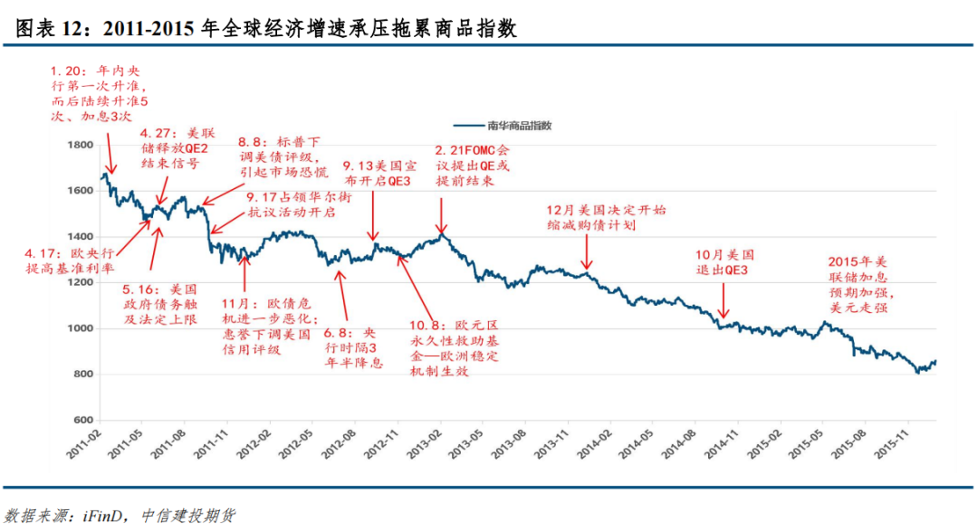 (2)2011年-2015年:全球经济增速下行,产能过剩,南华商品指数持续走弱。