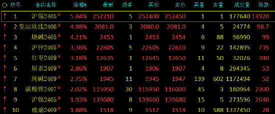 午盘收盘,国内期货主力合约涨跌互现,沪锡涨超5%,集运指数(欧线)涨近5%,烧碱涨超4%,沪锌、红枣涨超3%,纯碱、尿素、碳酸锂涨超2%。跌幅方面,苯乙烯(EB)、液化石油气(LPG)、低硫燃料油(LU)跌超1%。