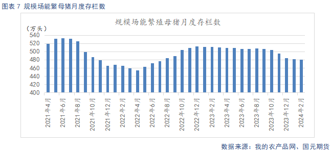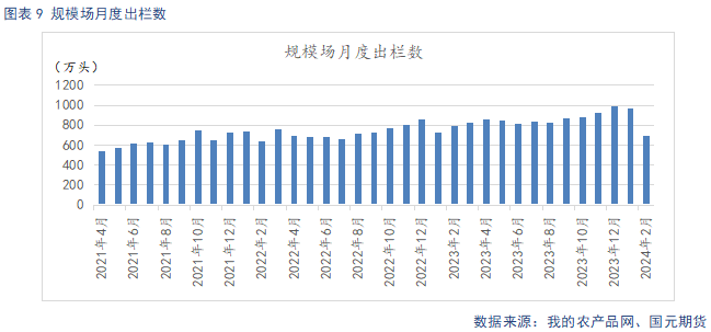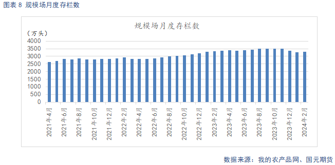 据Mysteel统计,截止2024年2月底,规模场能繁母猪存栏量为481.06万头,环比下滑0.26%,同比下降5.88%。北方疫病影响减弱,加之市场对后期市场预期偏强,规模场调减产能的速度放缓。规模场2月存栏数为3307.67万头,环比上升1.03%,同比下滑0.37%。2月出栏量为696.99万头,环比下滑27.56%,同比下滑12%。2月春节放假,出栏天数减少,加之节后消费惯性回落,2月出栏量环比下滑幅度较大。3月规模场出栏计划大增,考虑到出栏天数增加,日均出栏量环比增幅不大。