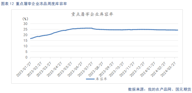 截止4月7日,重点屠宰企业日均开工率为27.63%,较上周环比上升0.23%。冷冻肉库容率24.05%,较上周环比下降0.1%,较去年同期高出2.34%。冻品库存高企,短期难以消化,进一步加大屠企资金压力,屠企按需屠宰,开工率恢复缓慢。