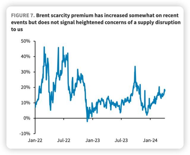衡量地缘政治风险溢价的指标布伦特期货曲线 (Brent futures curve) 稀缺性溢价比去年10月巴以矛盾开始时下降约3%,尽管库存情况相对紧张,但这表明市场参与者可能并不过度担心潜在的重大供应中断。