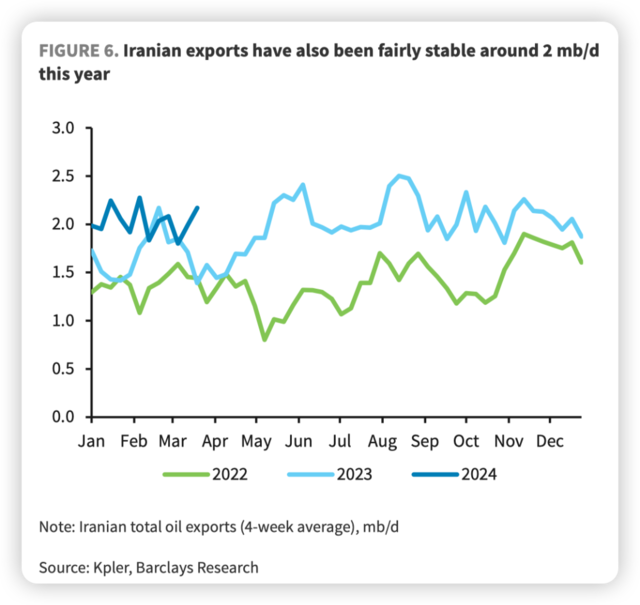 另一方面,自今年年初以来,伊朗的石油出口总量一直保持在200万桶/天左右。