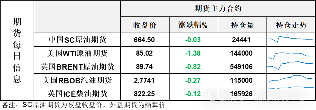 【1】WTI主力原油期货收跌1.19美元,跌幅1.38%,报85.02美元/桶;布伦特主力原油期货收跌0.74美元,跌幅0.82%,报89.74美元/桶;INE原油期货收跌0.03%,报664.5元。
