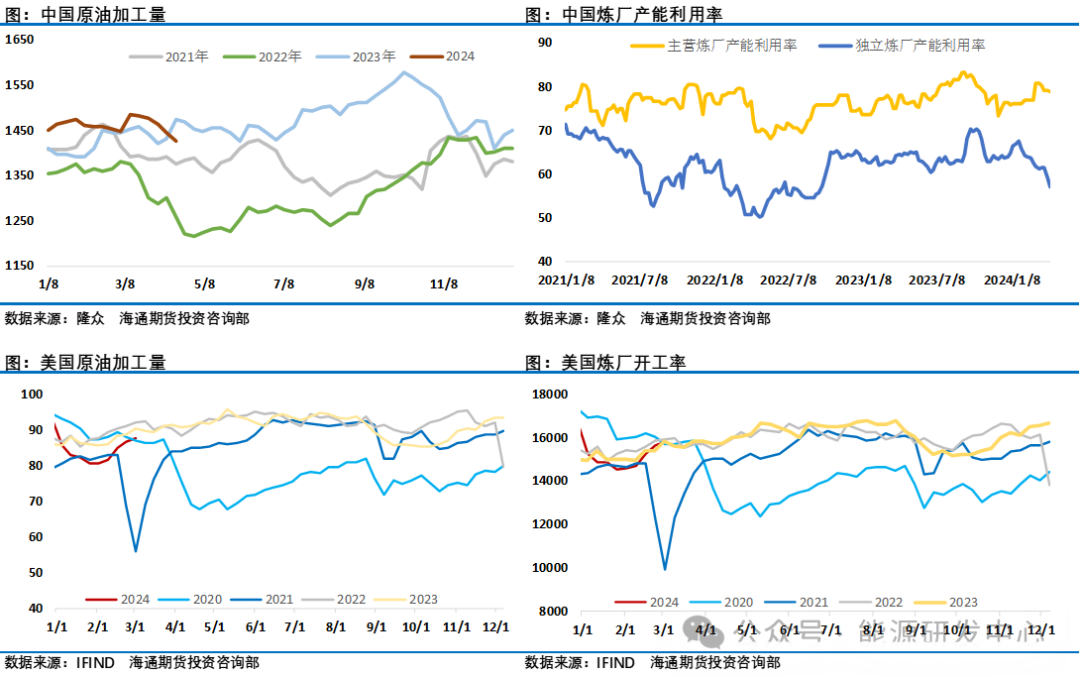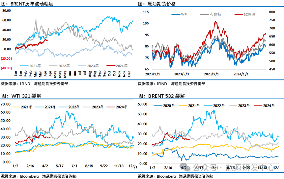 总体来看4月份三大机构月报没有像3月份那样给油价带来明显的推涨动力,IEA和EIA对需求的下调有为油市降温的意图,但并没有引起市场的重视,没有给油价带来明显的负面冲击。从周度数据来看美国原油加工量正在回升阶段,而最近一个月中国市场进入传统的地方炼厂检修季,国内原油加工利润处于低位也推动了炼厂检修意愿,独立炼厂开工率刷新了一年半来的低点。现阶段需求端给油价带来的影响相对有限。相对于机构的下调需求预期来讲,投资者注意力仍然集中在了中东地缘风险层面带来的供应中断风险,过去一周围绕以色列和伊朗直接的冲突一波三折,这也让投资者对油价判断摇摆不定,地缘溢价整体维持在高位。