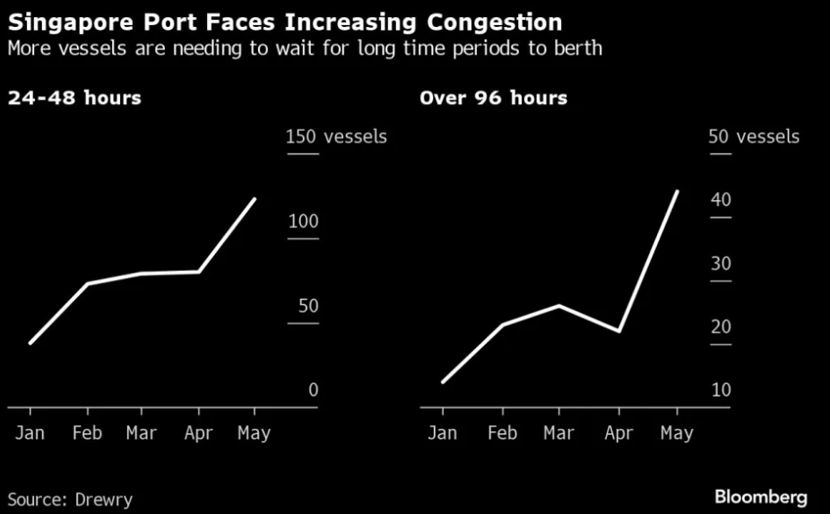 上述排队时间猛增的现象,在德鲁里的数据中也能得到印证——上个月在新加坡港口外排队等待至少四天(96小时)的集装箱船只数量达到了约44艘,而一月份时仅为14艘。