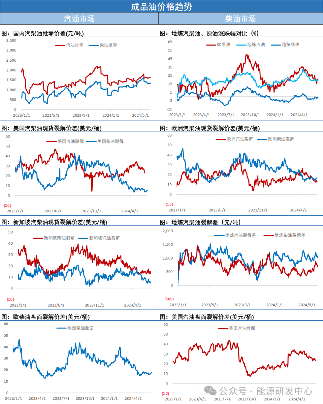 晚间美国公布数据显示至6月8日当周初请失业金人数录得24.2万人,为2023年8月12日当周以来新高。美国5月PPI月率录得-0.2%,为2023年10月以来最大降幅。这样的数据再次提升美联储降息预期,美元急挫,油价也从日内回调中走出反弹行情,本周众多的宏观数据给风险资产波动带来扰动,节奏把握上面临挑战。总体来看油价进入超买修复节奏,油价需要通过回调确认支撑来巩固阵地,并消化5月份震荡区间阻力,高频指标显示原油月差小幅回落,但成品油裂解差尤其是柴油裂解差进一步走强,油价后续想进一步走强需要供需层面进一步改善迹象来提供上行驱动,注意节奏把握,谨慎参与。