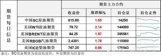 【1】WTI主力原油期货收涨1.67美元,涨幅2.14%,报79.72美元/桶;布伦特主力原油期货收涨1.63美元,涨幅1.97%,报84.25美元/桶;INE原油期货收涨1.65%,报615.8元。