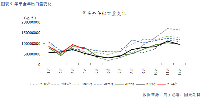 据海关总署数据显示,24年4月,我国苹果出口量为7.39万吨,环比下降21.7%,同比增长38.13%。鲜苹果出口有季节性规律,四季度和来年的一季度为出口旺季,季节因素下,4月出口环比下滑,但是同比增长幅度较大,主要是适合出口的货源价格走弱,成本优势明显。今年以来,我国苹果出口数据表现亮眼,2024年1-4月份累计出口30.72万吨,同比增幅27%,在历年出口数据中处于较高水平,不过我国每年出口量占总产能的比例在2-3%左右,鲜果消费主要还是依靠内需,在内需低迷的大背景下,外贸向好对苹果支撑力度有限。