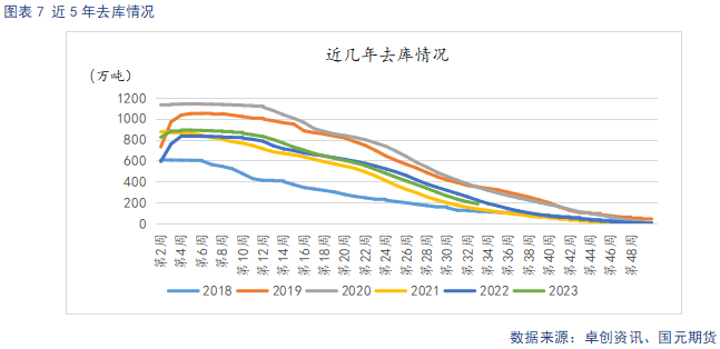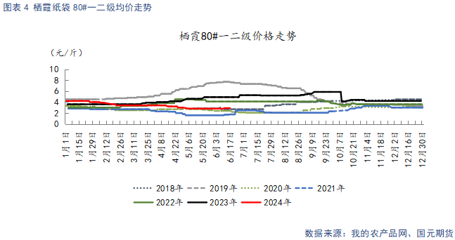 时令水果逐步上量,价格持续走弱,苹果受替代水果冲击明显,走货偏慢,市场上以优果优价为主。不过冷库剩余货源不多,果农急售情绪有所下降,现货价格在低位相对平稳。当前10合约关注点还是在新季生产情况上,今年新季套袋量各主要产区有增有减,但今年花期未遭遇倒春寒灾害影响,去年受灾区域今年产量恢复明显,整体套袋量高于去年。并且目前来看,因天气情况良好,商品率预计较去年也有明显提升。市场对新季产量、质量均有增长预期,加之本季苹果销售困难,不少贸易商亏损,对新季的收购规模较为谨慎,市场不断下调对新季开秤价的预期,基本面整体偏弱。建议区间6500-7500元/吨。