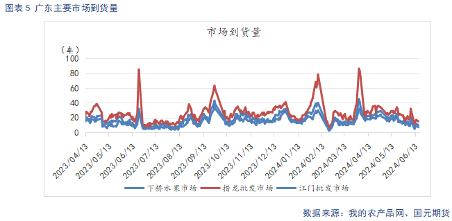 据卓创资讯统计,截止6月13日,全国冷库库存量为186.46万吨,单周出库19.65万吨。其中山东地区冷库库容比为21.56%,库容比下降1.26%。陕西冷库库容比为10.27%,单周下降1.51%。端午后进入消费淡季,加之冷库剩余货源不多,以客商货源为主,按需发货,出库逐周缩量。