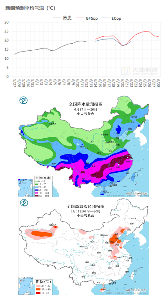 数据来源:中国棉花信息网,大地期货研究院天气:新疆局部地区高温预警,华南华东降水偏多