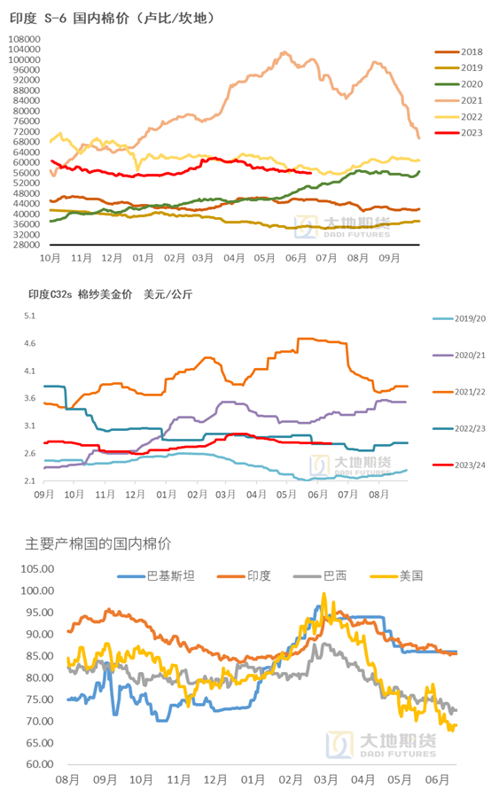 印度国内棉价周末下跌,其中S-6棉花价格至56000卢比/坎地(85.5美分/磅),较前一周基本持平。
