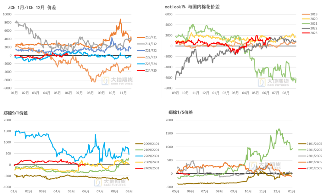 数据来源:中央气象台,路透,大地期货研究院内外棉价维持高位,ICE期棉7/12走弱,远月月差走强