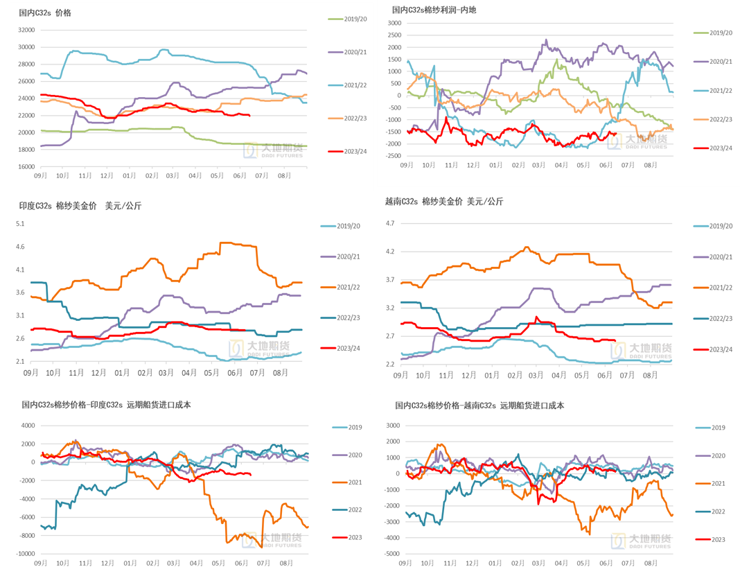 进口棉花棉纱:中性 1)因外盘下跌,内外现货价差再度扩大。2)越南纱经过大幅下跌后,远期报价基本与国内棉纱价格平水。3)印度纱、巴纱远期船货报价偏弱,进口棉纱订货意愿不强。