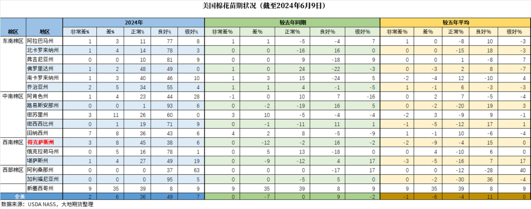 数据来源:USDA,大地期货研究院美棉苗情:全美优良率56%,得州优良率44%,环比下降
