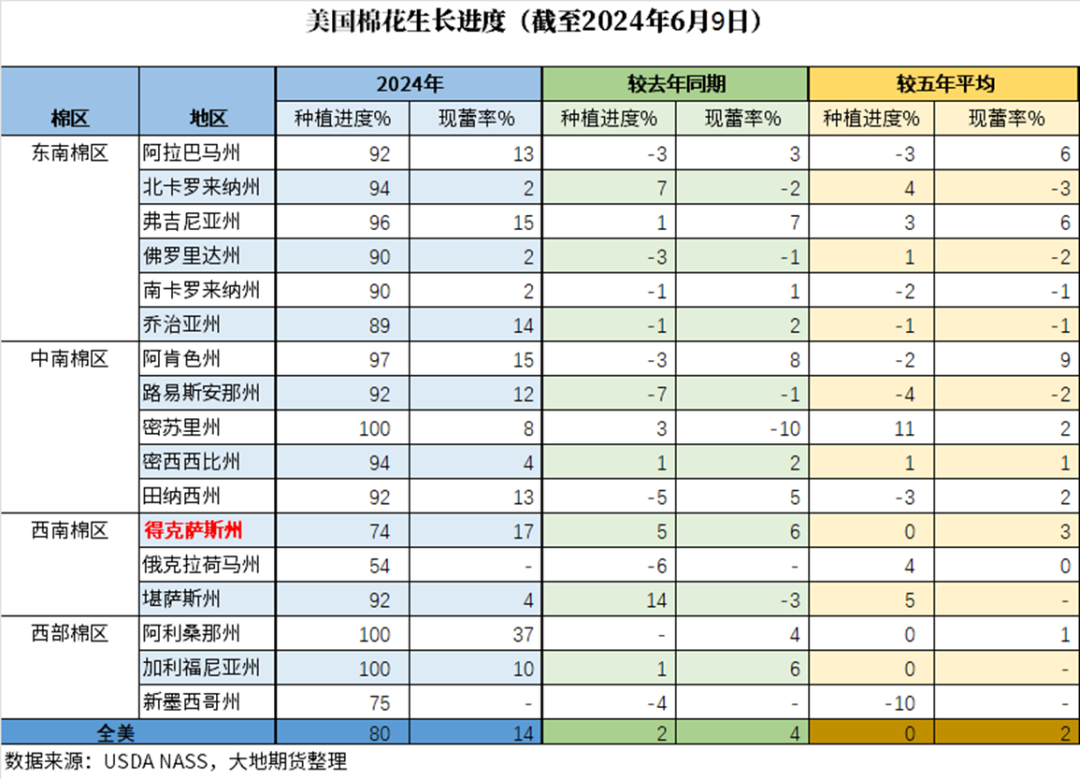 数据来源:USDA,大地期货研究院美棉种植:种植进度80%,现蕾率14%,快于去年