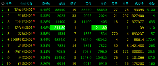 午盘收盘,国内期货主力合约涨跌互现,碳酸锂、工业硅、纯碱跌超5%,玻璃、铁矿石、沪银跌超3%,焦煤、焦炭、硅铁跌超2%,涨幅方面,集运指数(欧线)涨超3%,短纤、鸡蛋涨超2%,豆一涨近2%。