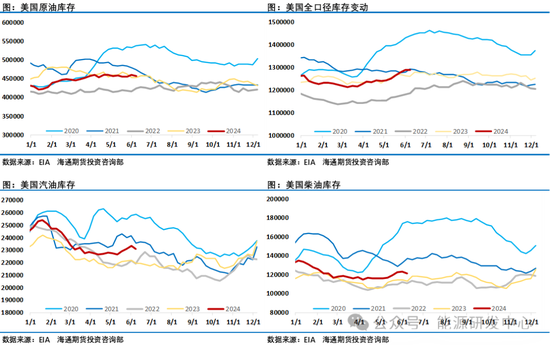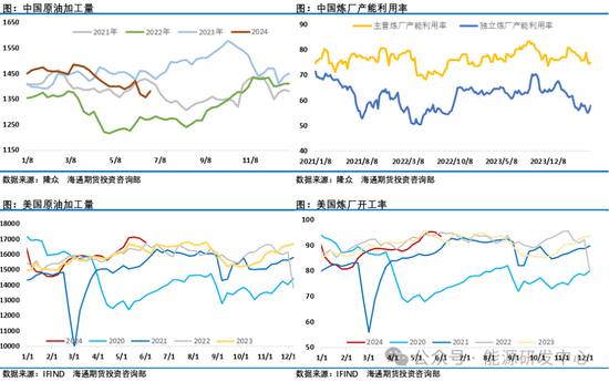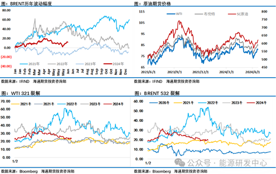 EIA报告显示06月14日当周除却战略储备的商业原油库存减少254.7万桶至4.57亿桶,汽油库存下降228万桶,精炼油库存下降172.6万桶,油品库存下降好于预期,另外数据显示美国当周成品油消费有明显反弹,接近与2023年水平,这也推动了成品油裂解利润稳定,尤其是前期一致弱于原油的美国汽油裂解差最近2个交易日开始回暖。包括高盛、荷兰国际和花旗在内的国际投行都指出了原油市场将面临供应短缺。花旗指出,由于全球原油和成品油缺口约为20万桶/天,油价将在夏季高峰期迎来看涨行情。如果仅考虑原油,则缺口更大。Kpler则认为随着夏季石油需求的增加和中东地缘政治紧张局势的加剧可能会推动布伦特原油接近每桶90美元。现货市场在夏季来临前趋于紧张,预计6月份全球原油需求量将环比增加170万桶/日,7月份将再增加107万桶/日。与此同时,胡塞武装在红海发动的袭击以及以色列与真主党之间的紧张局势加剧,使得市场对原油价格的看涨情绪略有升温。正是这种机构整体性的高预期,结合原油市场在欧佩克+会议之后处于一个利空出尽、局势回暖的窗口给油价带来了一轮超预期的反弹。目前来看在6月份这个阶段给市场已经给了油价一个较高的预期,后续供需层面能否出现符合预期的改善将成为市场的关注点。