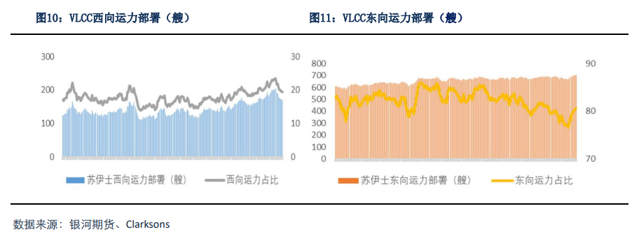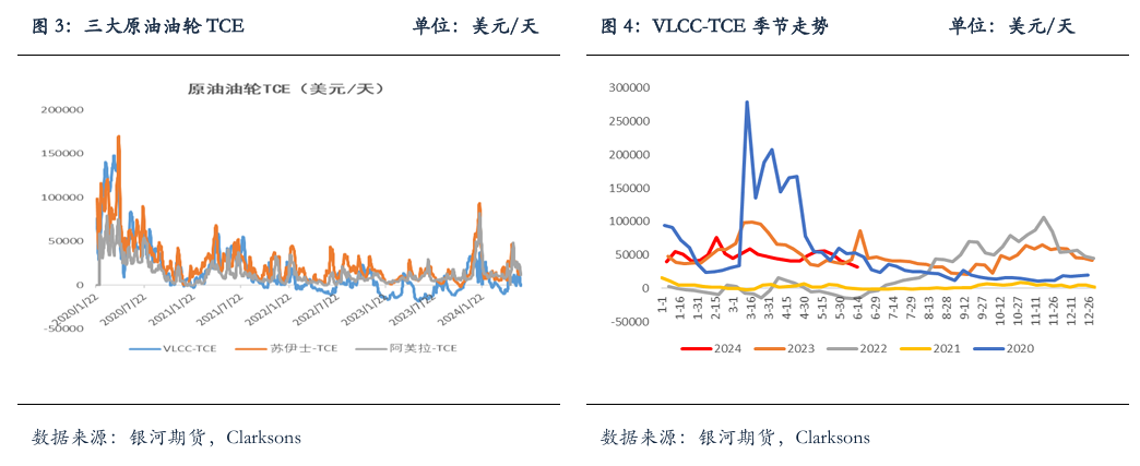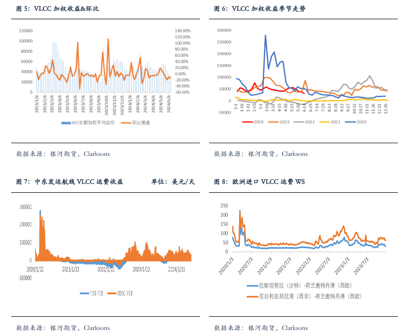从运力结构来看,VLCC东西运力一直处于分布不均的状态,东向运力一直远超西向运力。2024年上半年西向运力部署均值达到200艘,东向运力部署均值达到691艘,该现象较4、5月正在缓慢加剧,二季度西部运力占比维持下跌走势。