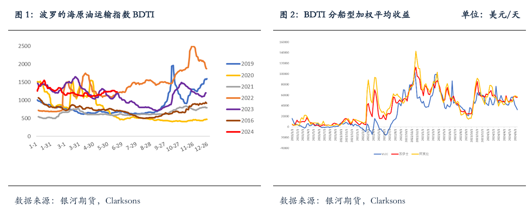 2024年上半年(截至6月上旬),BDTI价格中枢环比上行,均价1235.33,环比上行21.66%,同比下降3.80%左右。整体来看,上半年呈现先扬后抑走势。