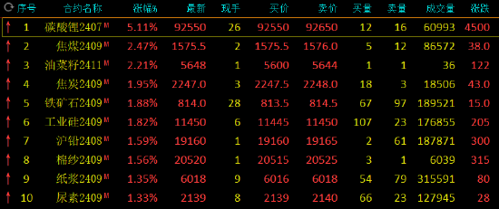 早盘收盘,国内期货主力合约涨跌不一,碳酸锂涨超5%,焦煤涨超2%,焦炭、工业硅、沪铅、棉纱、铁矿石涨超1.5%。跌幅方面,沪锡跌超3%,锰硅、20号胶跌超2%,氧化铝、沪银跌近2%。