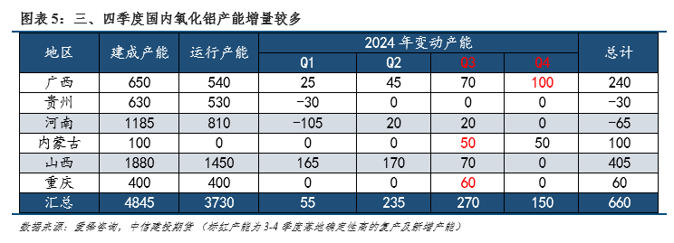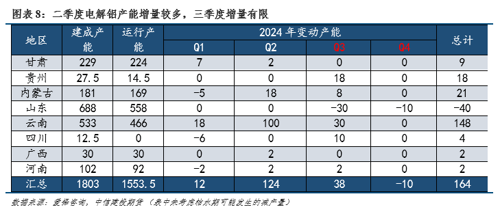 95%的氧化铝用于生产电解铝,电解铝生产较为稳定,因此氧化铝的价格弹性受供给端影响更大,消费端的影响更多体现在电解铝运行产能的季节性变化上。每年电解铝运行产能变动较大的集中在云南地区,主要呈现枯水期(11月-次年4月)减产,丰水期(6月-9月)复产的特点。今年云南外输电量减少叠加新能源发电增加,电解铝企业从3月便开始复产,这使得消费端的供应增量大幅提前,二季度在国内矿石供给缺失的背景下,供需缺口迅速扩大。3季度来看,电解铝供应增量大幅下滑,仅云南和贵州、四川有少量产能复产,合计增量规模在38万吨左右。而云南地区进入10月之后,电解铝运行规模随着水电发电量下滑仍有减产的可能,减产规模预计低于2023年的水平,预估在50-70万吨左右。