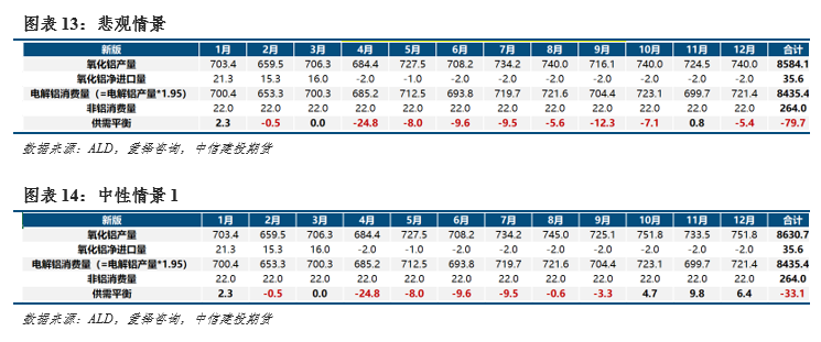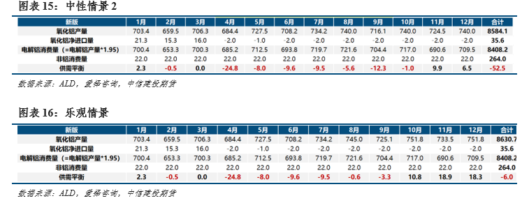 我们假设四种情景:悲观情景—国产矿山复产规模未进一步扩大,且枯水季云南电解铝未发生减产;中性情景1—国产矿山复产规模扩大,枯水季云南电解铝未发生减产;中性情景2—国产矿山复产规模未进一步扩大,枯水季云南电解铝发生减产;乐观情景—国产矿山复产规模扩大,且云南电解铝发生减产。我们发现除了悲观情景全年呈紧缺外,其余三种情景均会在4季度转为小幅过剩。