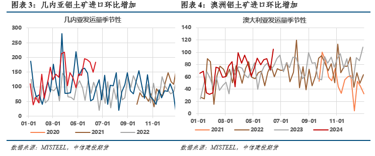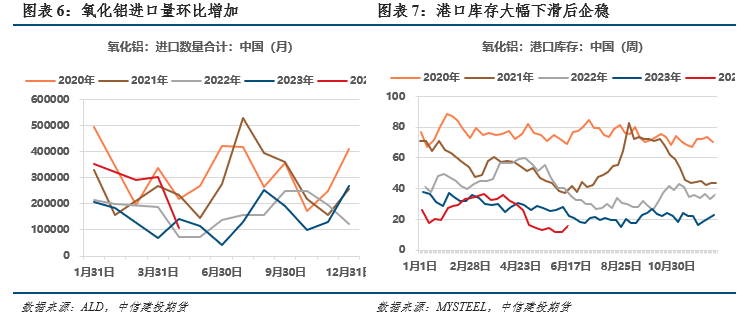 今年进口矿产量环比大幅增加,一定程度弥补国产矿不足。5月中国进口铝土矿1355万吨,同比增长4.7%;1-5月累计进口铝矿砂及其精矿6404万吨,同比增长5.8%。截至6月中旬,从几内亚进口铝土矿3242万吨,同比增加15.8%。从澳大利亚进口铝土矿1733万吨,同比增加19.5%。近期天山铝业几内亚项目开始开采,DM 矿业公司第一船铝土矿开始装载,该项目后续每年将为几内亚增加600万吨铝土矿出口,进口环节矿石供给将持续增长。目前铝土矿港口库存2297万吨,较年初增加145万吨。