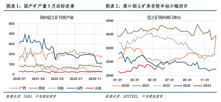 关于国内矿山复产预期的交易一直贯穿于今年的行情之中,而复产时间的不断推迟则是今年行情走强的主要驱动。山西地区铝土矿山在去年12月受安全检查影响多数停产,包括全部的坑采矿及多数的露天矿,年初市场普遍预期矿山复产时间在4月,但实际情况是5月中旬才有少量的坑采矿和部分的露天矿开始复产。在此之前,使用国产矿生产的部分企业因矿石不足,相继发生了减产检修、掺配进口矿生产导致微量元素超标等问题,供应端扰动较为明显。目前山西、河南坑采矿山略有增加,叠加前期广西及贵州部分民采矿恢复,国产量供给整体呈现边际改善,不过山西地区规模性复产时间仍未确定。5月铝土矿产量492.5万吨,环比4月增加6.9%。1-5月国内铝土矿累计产量2275.6万吨,同比去年下滑19.6%。