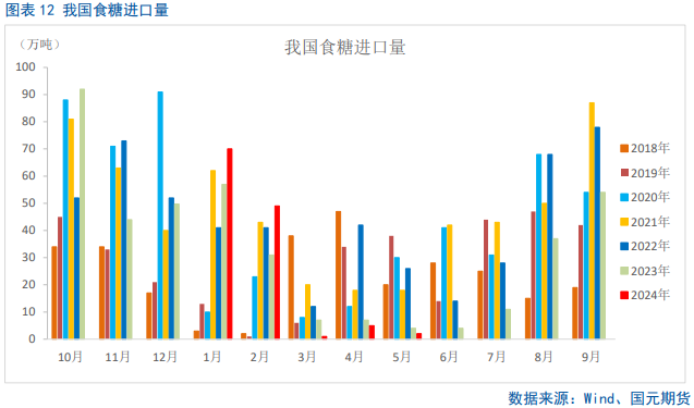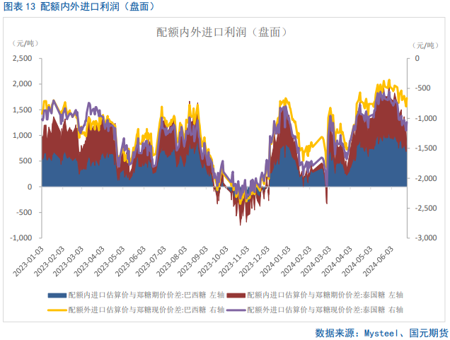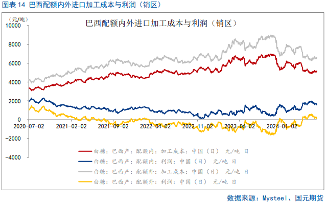 2024年 3-5月,我国食糖进口量严重低于去年同期水平,考虑到2个月的船期,3-5月的买船到港正值巴西糖配额外利润为负时的时间窗口;虽然2024年4月原糖大跌之后,内外价差缩窄,巴西糖配额外进口利润打开且转正,高于 2023 年与 2022 年同期时的配额外进口利润区间,但是当前进口糖供应压力还未显现,预计4-5月加工糖厂点价后的买船到港时间将为三季度。