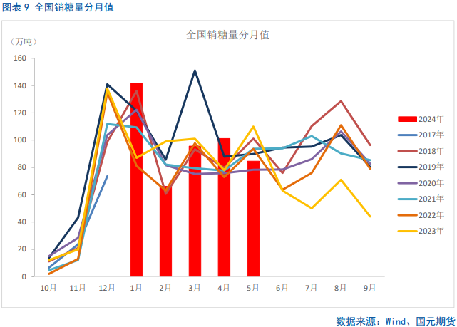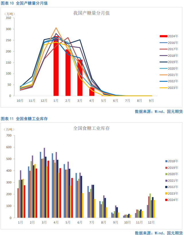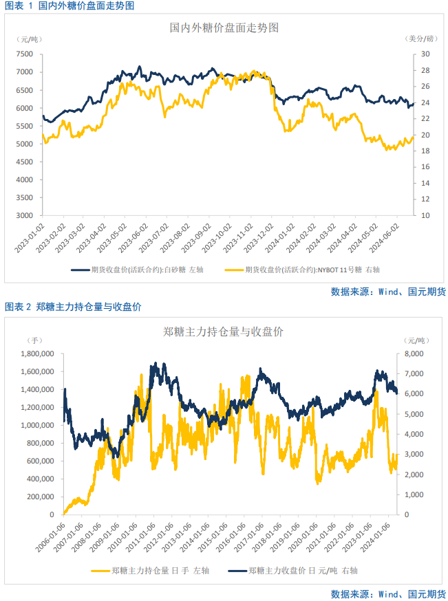 新榨季主产国均有不同程度的增产预期,全球食糖供需格局逐步转向过剩,基本面上白糖在2024年是一个偏空的品种,ICE原糖的重心将逐步下移。目前全球食糖供应与贸易主要依赖巴西,从5月份公布的两次巴西压榨量与产糖量数据来看,均不及市场预期;此外,印度下一个榨季食糖出口政策不确定性很大,从这一点上来看,原糖在下跌过程中不排除有阶段性反弹。国内方面,新榨季国产糖有继续增产的预期,前期配额外进口利润窗口显现期间出现的买船预计将在三季度集中到港,下半年国内食糖货源由紧变松,待基差修复后,预计郑糖盘面走势偏弱。