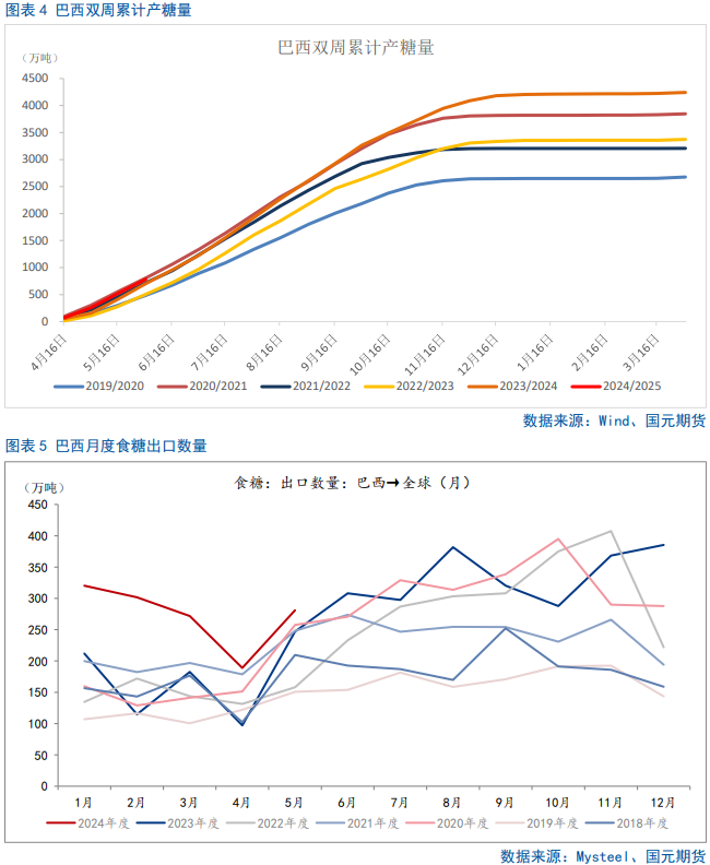 5月巴西甘蔗压榨与食糖生产均不及市场预期巴西甘蔗行业组织UNICA公布的数据显示,5月上半月巴西中南部地区甘蔗压榨量总计为4,475万吨,较去年同期增长0.43%,略低于市场预期。UNICA在报告中称,5月上半月糖产量为257万吨,较去年同期增长0.97%,乙醇产量增长2.14%,至19.9亿公升。5月下半月巴西中南部地区糖产量亦低于预期,用于榨糖的甘蔗数量连续第二次低于分析师的预期。UNICA发布报告称,5月下半月糖产量为270万吨,同比下降7.72%;甘蔗压榨总量为4520万吨,同比下降3.36%;乙醇产量小幅下降0.2%,至21.2亿公升。但从5月份巴西产糖量不及市场预期这单一因素上不足以推翻2024/25榨季巴西继续丰产的定调,虽然目前有部分国外机构将巴西2024/25榨季产糖量预估值下修了80万吨,但只要巴西新榨季产糖量维持在4000万吨以上,就是有史以来的次高位产糖量。