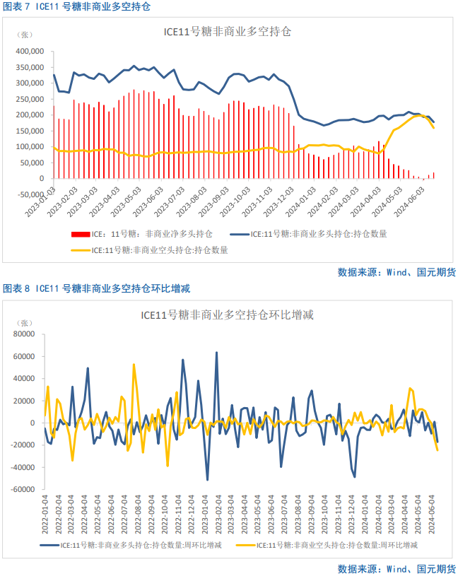 6月巴西中南部地区产量连续两周不及预期,巴西产量前景可能低于预期,但巴西出口量同比增加。CFTC公布的最新周度持仓报告显示,截止6月18日当周,对冲基金及大型投机客持有的原糖净多头仓位为18524手,较之前一周增加7454手,多头持仓为177819手,较之前一周减少17111手,空头持仓为159295手,较之前一周减少24565手。