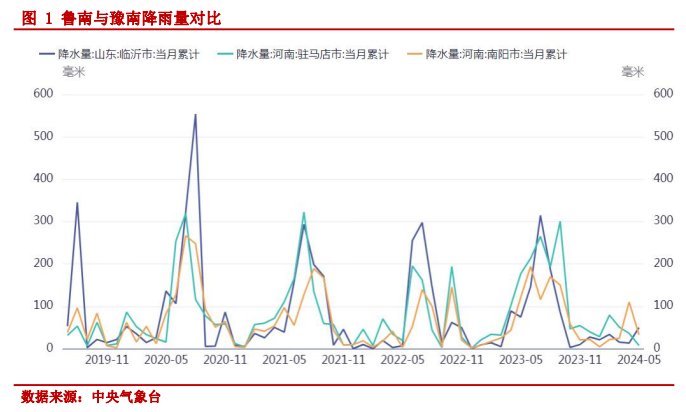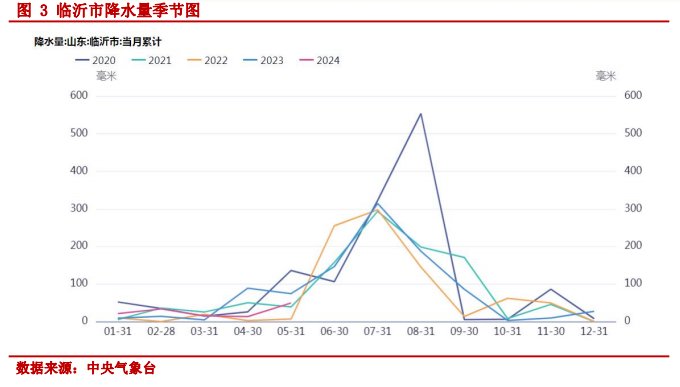 据农户反映,从过年之后,临沂地区就没有下过透地雨,主要以零星小雨为主。从降雨量来看,根据中央气象台的数据,2024年1-5月份,临沂地区5个月的累计降水量仅有113.9毫米,属于严重干旱,仅仅高于2022年极度干旱大减产情况下同期38.5毫米的降水量,在近五年的同期降水量中位列倒数第二。6月份有人工降雨,但大部分地区以小雨为主,局地冰雹。干旱维持时间很长。幸运的是,在春花生和麦茬花生的种植阶段,皆有小雨出现,因此并没有过分影响种植,除少量条件较差地块改种外,有花生种植意愿的大部分都种上了。