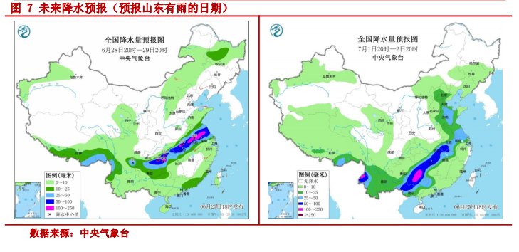 由以上分析可知,产量是否产生较大影响,取决于近两周是否能够产生有效降雨。从气象变化来看,滞留南方的副热带高压脊正在酝酿北抬,江淮气旋向东北行进并不断加强,江淮-黄淮干旱区将在6月29日迎来降雨。而从降雨强度上来看,鲁南地区仅仅预报了小雨,估计无法缓解旱情。7月份,副高继续北抬,我国主雨带将北上至两湖地区以及河南、山东一带。从天气预报来看,鲁南地区7月1-2号有雷阵雨,3号往后是长时间的连阴雨。时间长变化多,旱情是否能有效缓解,以及是否会出现旱涝急转的现象,是未来我们关注的重点。