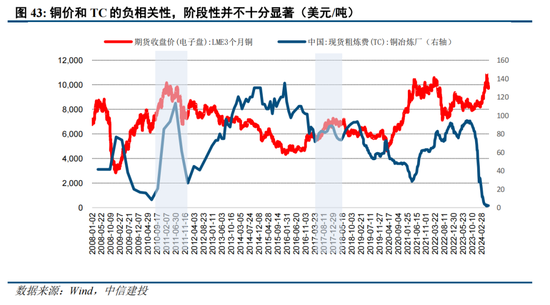 过往价格来看,铜价上涨的阶段同样并不必然对应着铜矿产能的低增速,比如2002-2006年,以及2016-2017年,铜矿产能增速都在3%以上的偏高水平。同样,代表铜矿供给情况的冶炼加工费与铜价的负相关性,也出现过阶段性打破。