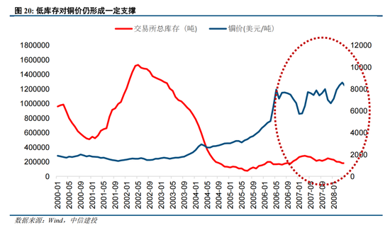 周期上行的中后期,低库存和罢工扰动仍对价格形成阶段性支撑。由于前期矿业投资减少,矿山新建和扩建有限,主要产铜国家和企业产量增长相对克制。三大期货交易所库存自2002年后持续下降,2005-2008年维持在历史低位水平。此外2006-2007年,大大小小的矿端罢工事件不断,阶段性对铜价仍形成支撑。