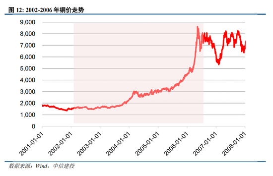 2001年中国加入世贸组织,铜市场迎来历史上持续时间最长,2002-2006是铜价涨幅最显著的牛市阶段。