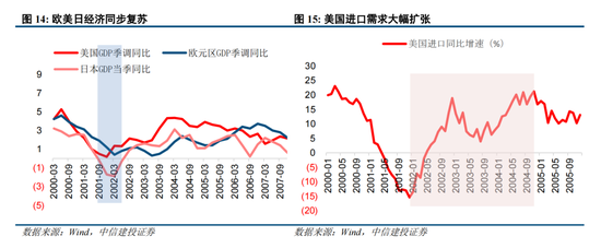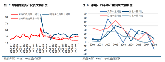 另一方面,房地产周期上行,地产投资和地产后周期消费需求爆发。工业化的发展迅速推进国内城镇化进程,国内地产销售和房地产投资迅速发展,地产后周期板块中家电和汽车生产大幅扩张。